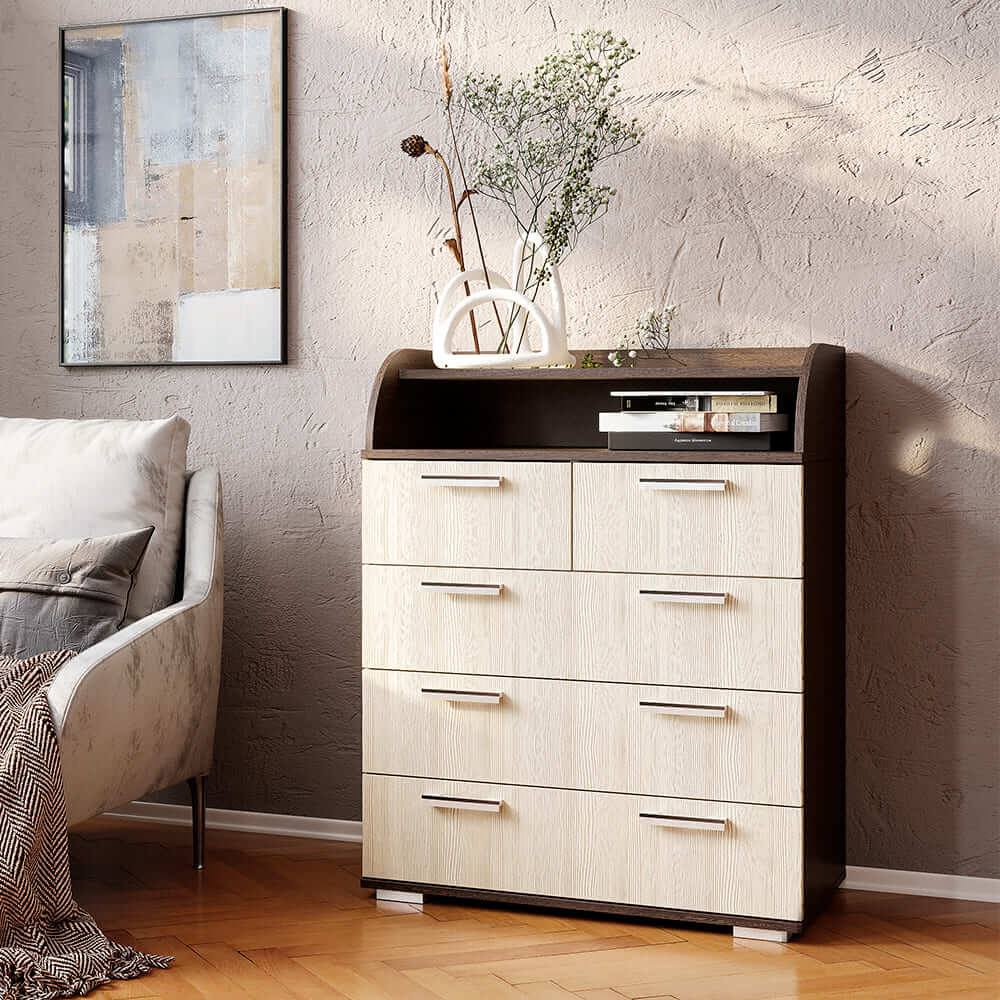 Комод «Стандарт № 1» отличается своей практичностью. Наряду с выдвижными ящиками, он имеет открытую полку, расположенную сверху, значит у вас появится дополнительное место для хранения вещей. Для облегчения открывания нижние выдвижные ящики оснащены одновременно двумя ручками геометрической формы, верхний – разделен на две секции для более удобного хранения.