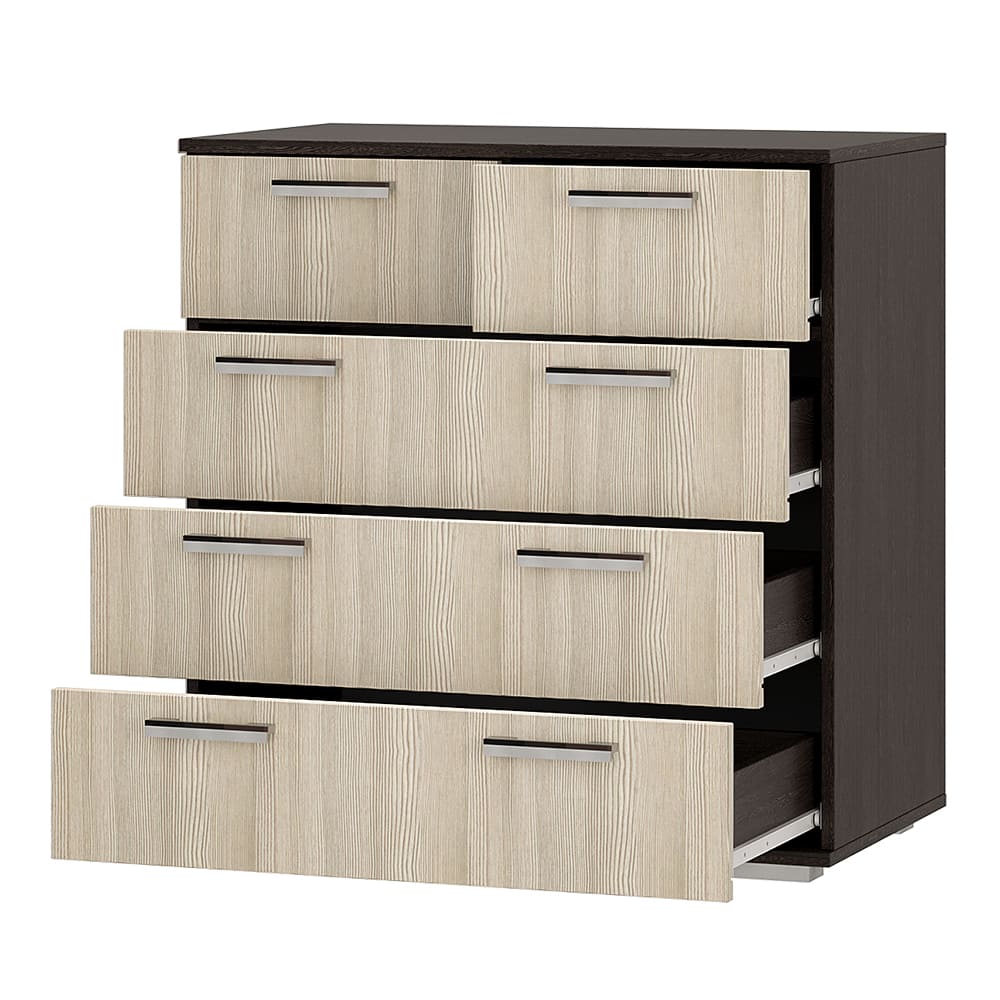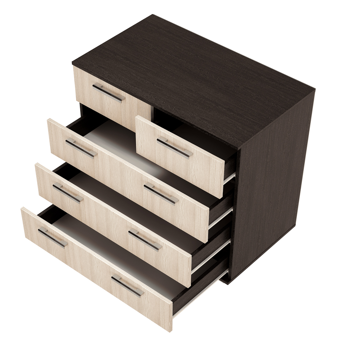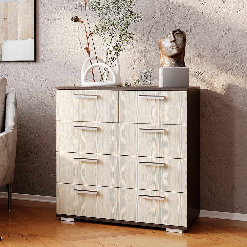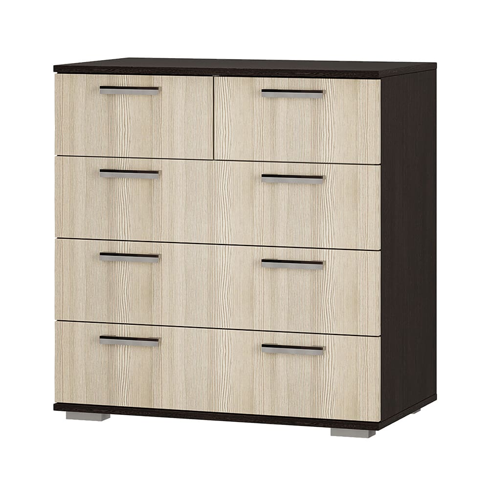 Классическая модель комода «Стандарт № 5» будет прекрасным выбором для любой комнаты вашей квартиры или дома. Для облегчения открывания на нижних ящиках расположились сразу по две ручки геометрической формы. Верхняя секция в данной модели разделена на две выдвижные части для вашего удобства.