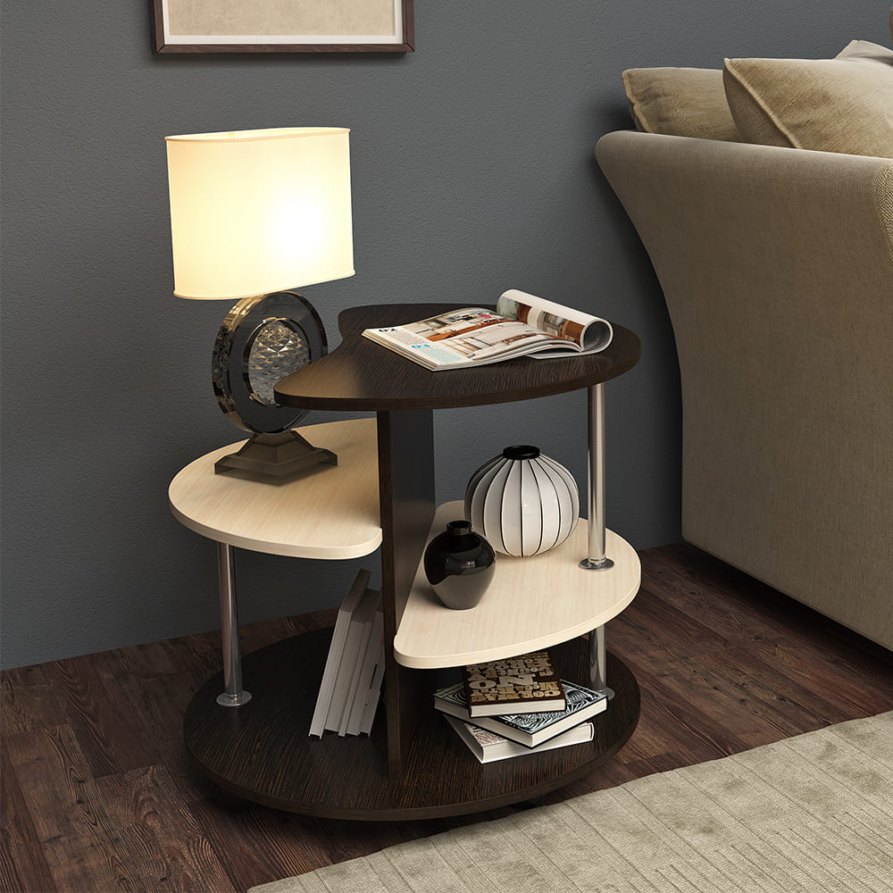 Журнальный стол "Соренто" станет практичным украшением вашей гостиной. Модель состоит из столешниц, находящихся на разном уровне и дополненных хромированными деталями. Такой дизайн придает изделию легкости. Сочетание контрастных цветов ЛДСП позволит столу стать частью интерьера любого стиля.