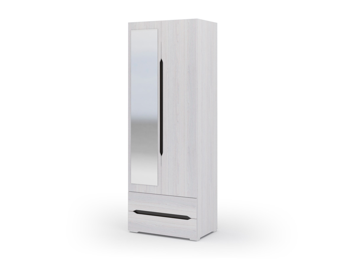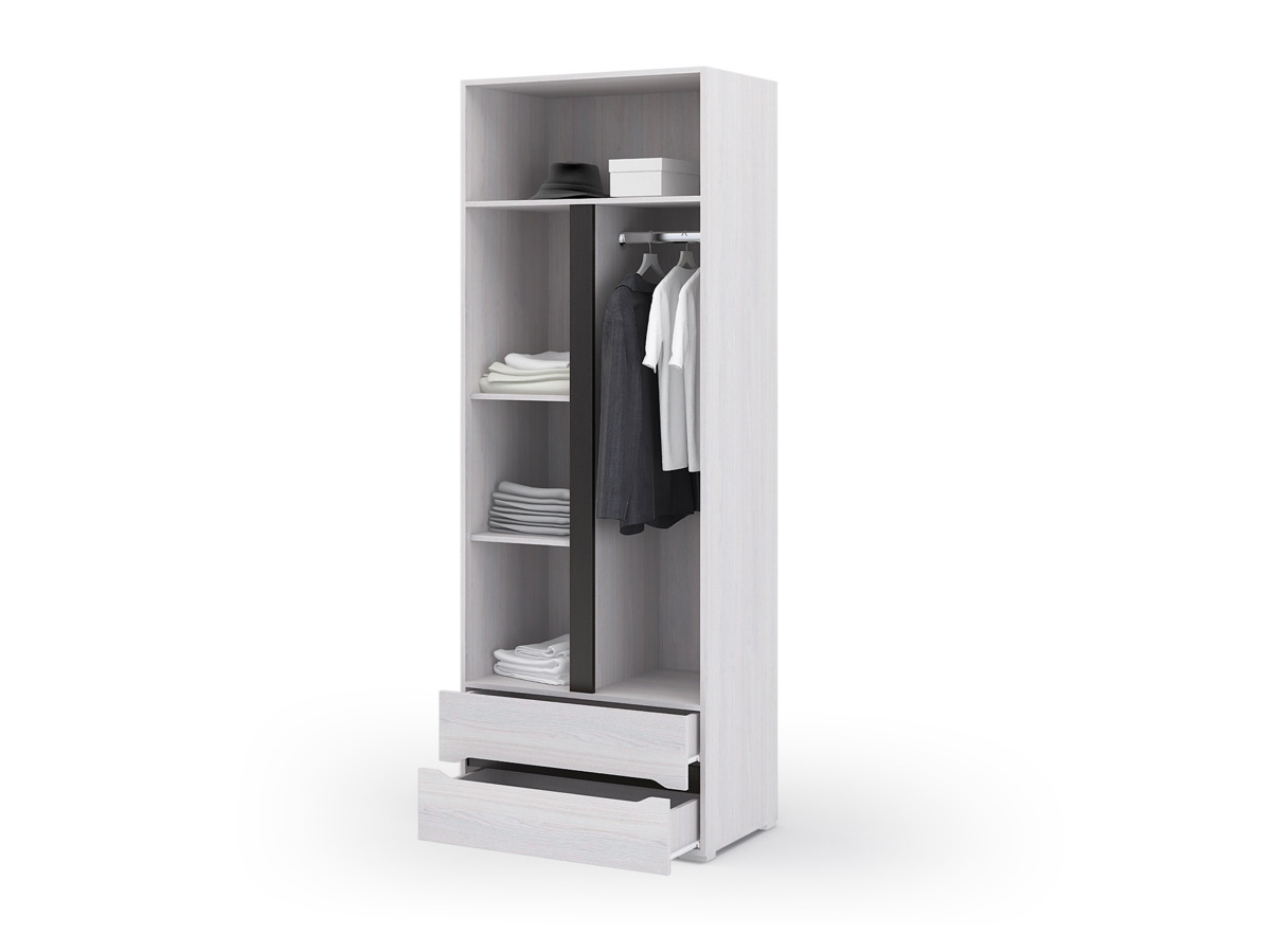 Комбинированная конструкция шкафа Валенсия ШК 011 включает в себя два выдвижных ящика и две отдельные секции с полками за распашными створками и платяным отделом, снабженным надежной металлической штангой для одежных плечиков.